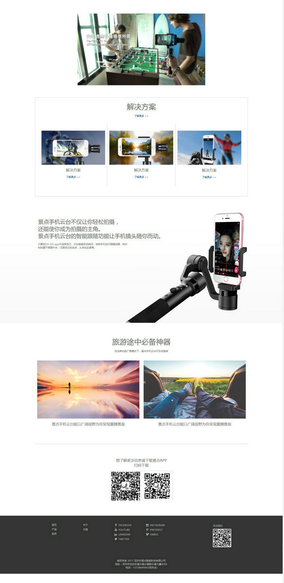 深圳市景点智能科技有限公司是专门从事智能摄像机器人的研发,生产,销售的公司。摄像机器人以智能,稳定,防抖等优点广泛应用于无人机摄像,马拉松比赛自拍,户外运动自拍,网红直播,不同场景的连续摄影,自媒体等。公司[敏感词]产品手机.相机智能3轴手持云台方案,此方案以强大的功能,[敏感词]的算法和APP的美颜功能收到客户的一致好评!后续还有更多的[敏感词]方案和产品在研发过程中。访问网站:www.jing-d.com感受万创网带给您的品牌体验!